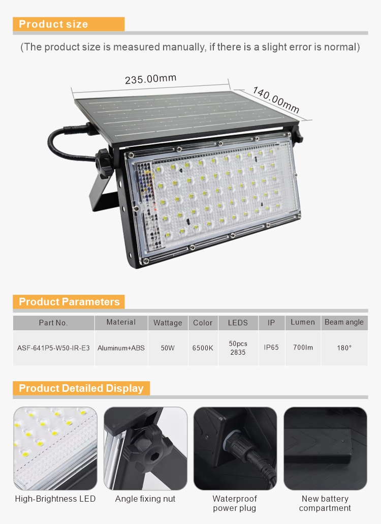 这种便携式一体化太阳能投光灯适用于客栈、花园、户外、衡宇,,,,,,作为夜间清静的附加照明。。。。无论是用于清静目的照旧照亮您的户外空间,,,,,,它都能确保最佳照明条件。。。。